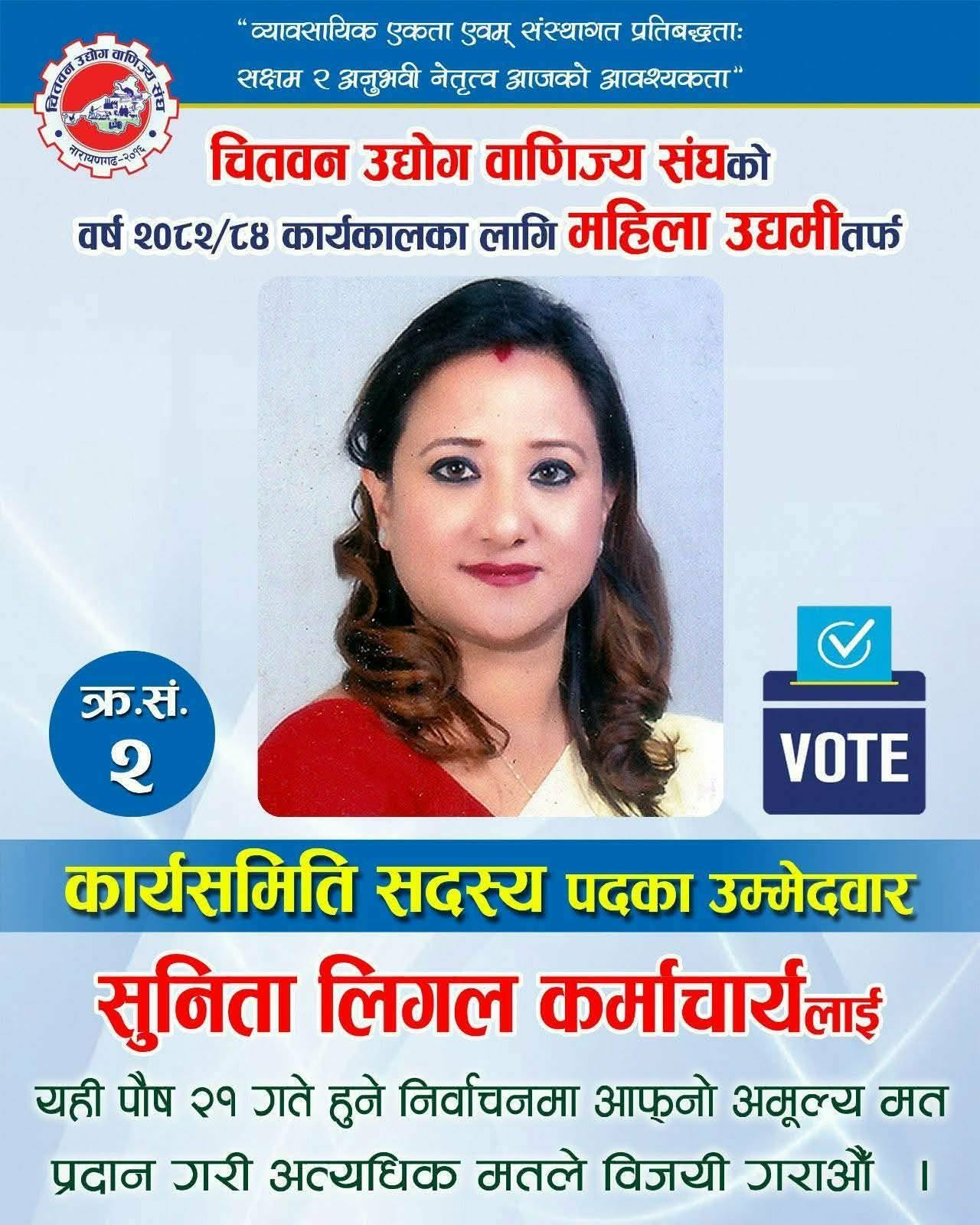 सुनिता लिगल कर्माचार्य चितवनको व्यवसायिक क्षेत्रमा सुनिता लिगल कर्माचार्य स्थापित र परिचित नाम हो। कुशल महिला उद्यमी, सशक्त…
