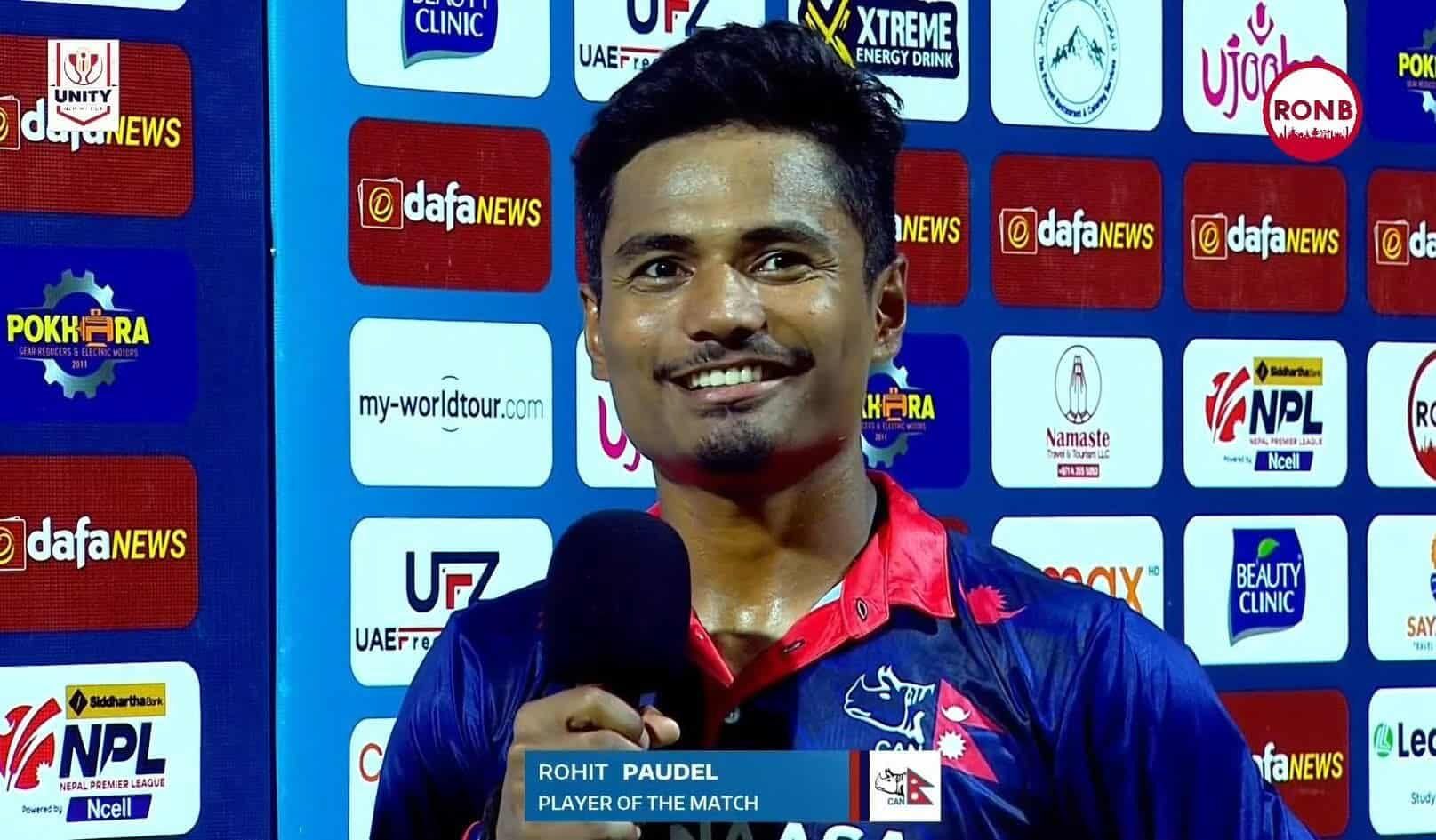 काठमाडौं/नेपालले वेस्ट इन्डिजविरूद्ध ऐतिहासिक जित दर्ता गर्दा कप्तान रोहित पौडेल प्लेयर अफ दि म्याच बनेका छन् । उनले बलिङ, ब्याटिङलर फिल्डिङमा उत्कृष्ट प्रदर्शन गरेका थिए । नेपालका तर्फबाट सर्वाधिक ३८ रन बनाएका रोहितले३ ओेभर बलिङ गर्दा २० रन खर्चेर एक विकेट लिए । आजको खेलमा उनको कप्तानि पनि उत्कृष्ट रह्यो ।