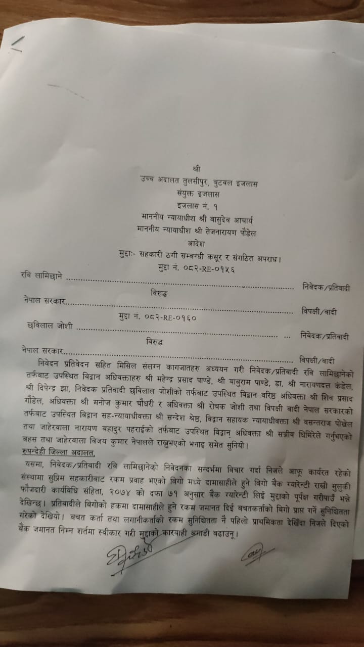 रुपन्देही/उच्च अदालत बुटवलले रास्वपा सभापति तथा पूर्व उपप्रधानमन्त्री तथा गृहमन्त्री रवि लामिछानेलाई रिहा गर्न आदेश दिएको छ ।सहकारी ठगी मुद्दामा पुर्पक्षका लागि थुनामा रहेका लामिछानेलाई रिहा गर्न आदेश भएको हो । रविलाई धरौटीमा रिहा गर्न आदेश भए पनि छबिलाल बन्जाडेको हकमा भने रिहाइको आदेश नभएको सूचना अधिकारी रामबहादुर कुँवरले बताए ।